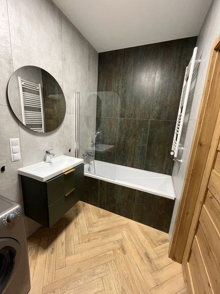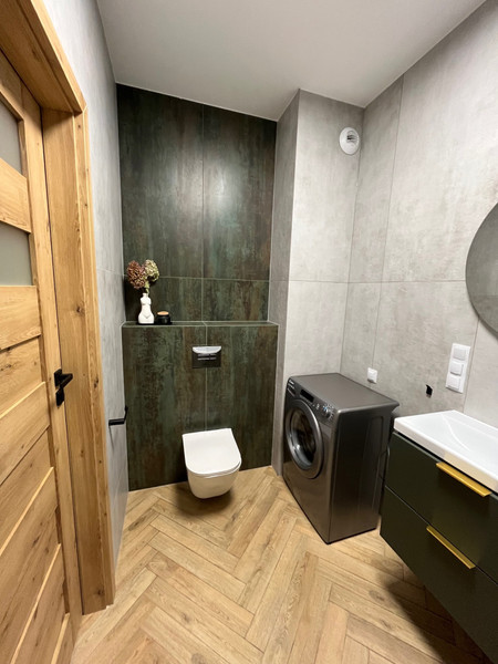 W łazience znajduje się wanna, pralka, szafka z umywalką oraz WC.