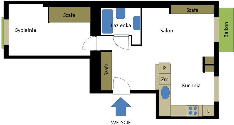 W mieszkaniu nie ma mebli ruchomych (sofy, stołu, biurka, krzeseł) — najemca wnosi własne wyposażenie.