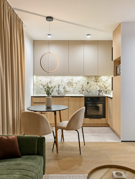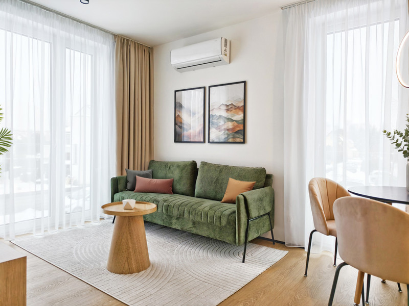 Mieszkanie jest w pełni wyposażone i gotowe do zamieszkania. Wysokiej jakości zabudowa kuchenna na wymiar. W kuchni wszelkie niezbędne sprzęty AGD (płyta indukcyjna, piekarnik, zmywarka, mikrofalówka, lodówka), w salonie telewizor, szafka RTV, klimatyzacja zapewniająca komfort przez cały rok.