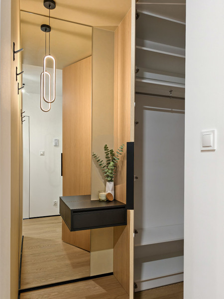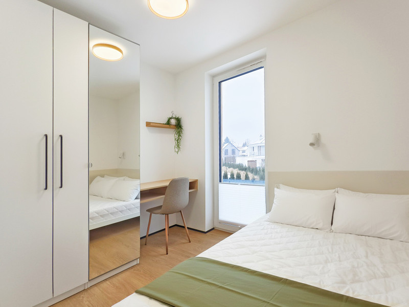 W sypialni łóżko szer. 160cm, duża szafa oraz biurko. Strefa wejściowa z zamkniętą garderobą.