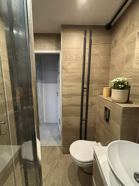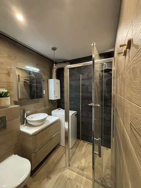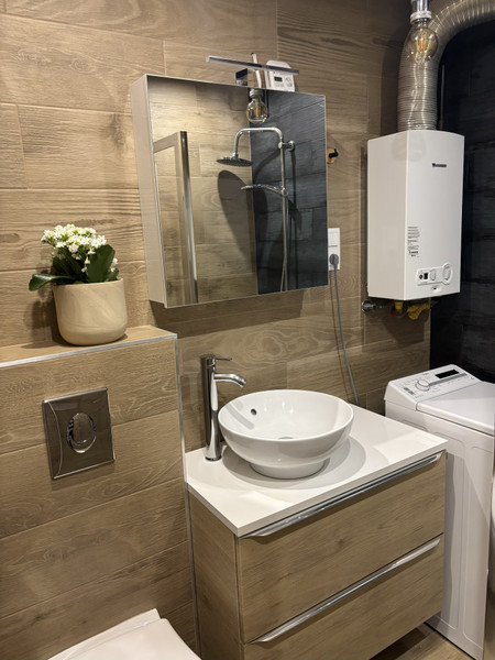 • Podgrzewanie wody realizowane przez piecyk gazowy (Junkers) w łazience