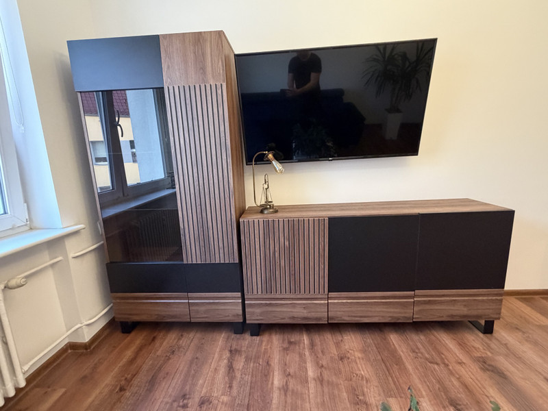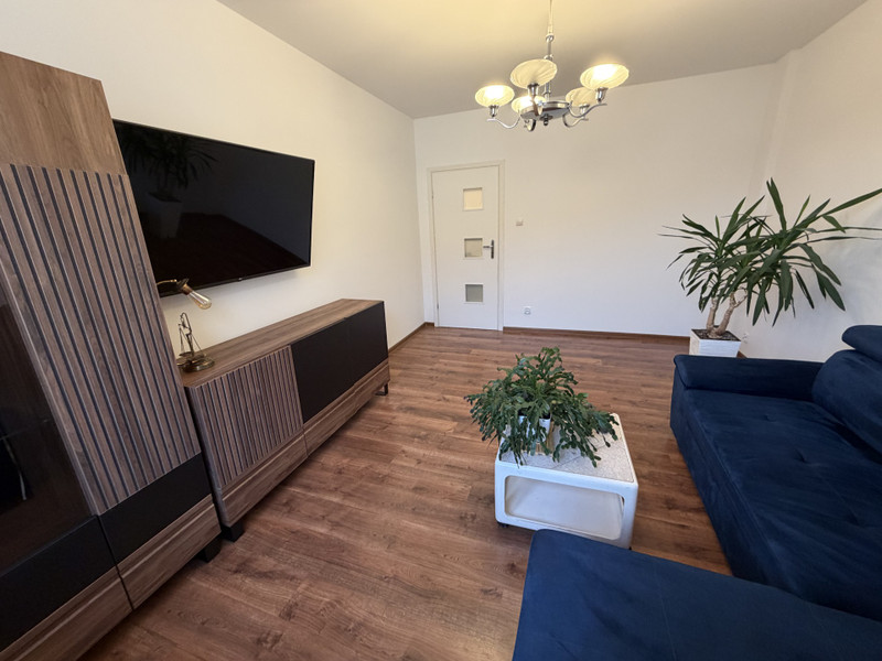 - przestronny salon z dużym nowym narożnikiem , nowymi meblami, stolikiem i wiszącym dużym TV,