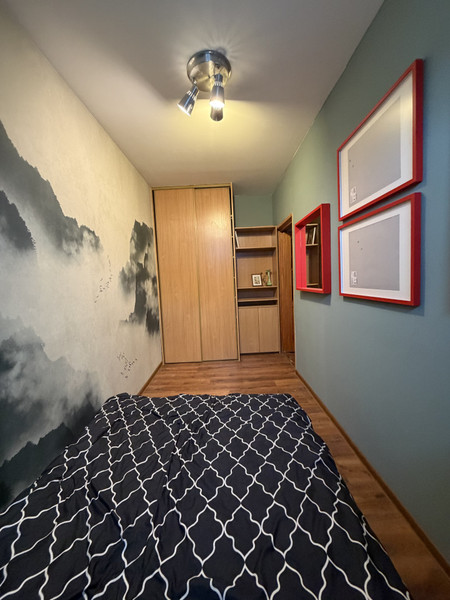 - przytulna sypialnia z dużym łóżkiem małżeńskim, szafą w zabudowie