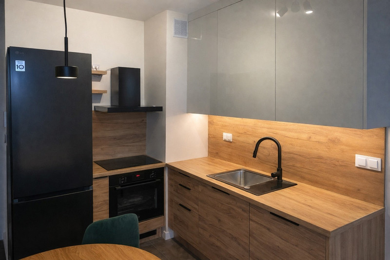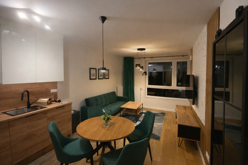 Pełna zabudowa kuchenna, wysokiej jakości wykończenie oraz starannie dobrane oświetlenie – mieszkanie gotowe do zamieszkania bez żadnych dodatkowych nakładów.