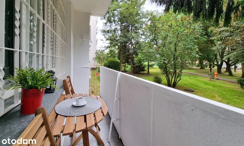 - Balkonu z widokiem na zielone podwórko: stolik + 2 drewniane krzesła