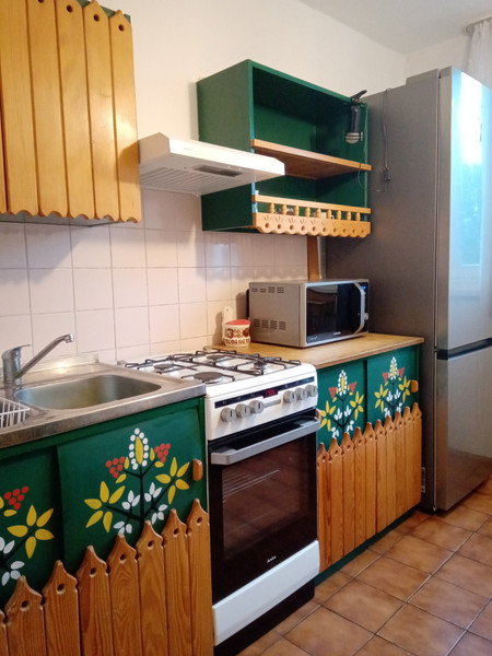 - w kuchni meble w stylu ludowym, lodówka i kuchnia gazowo-elektryczna;