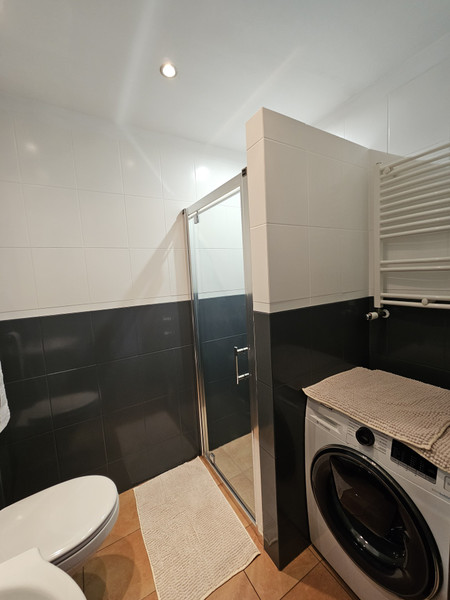 Wyposażona kuchnia (płyta indukcyjna, piekarnik, lodówka), łazienka (wc, umywalka, prysznic, pralka), oraz pokój (duża rozkładana rogówka i stolik kawowy).