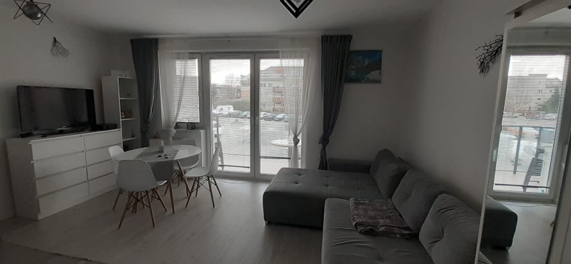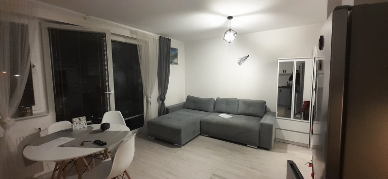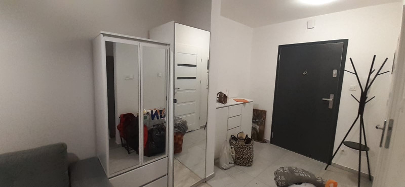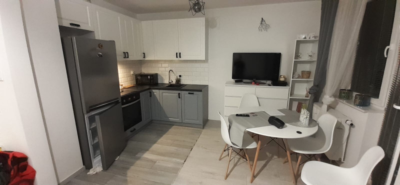 dużego pokoju o pow. 20 m2 w - pełni umeblowanego w duże narożne łóżko, stół z krzesłami, dwie szafy regał i komodę - z aneksem kuchennym wyposażonym w zmywarkę do naczyń, piekarnik, mikrofalę, lodówko-zamrażarkę, okap, płytę indukcyjną)