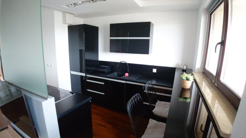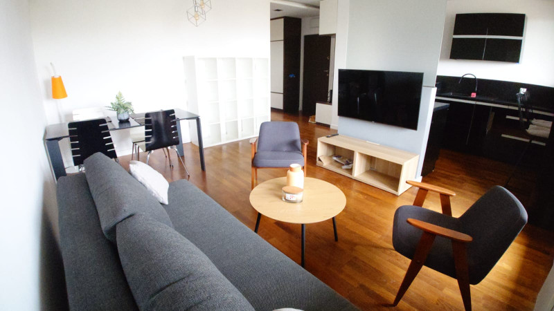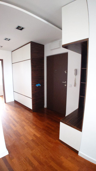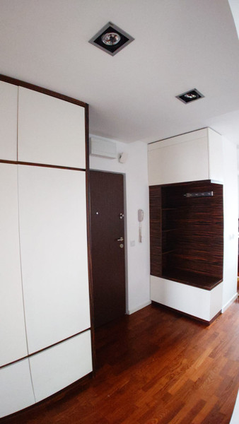 • w całym mieszkaniu zabudowa meblowa na zamówienie, lakier na wysoki połysk łączony z fornirem hebanowym, uzupełniona o wyposażenie ruchome z różnych miejsc. Przykładowo w salonie znajdziecie stół Kartell, krzesła Moma Studio, kanapę od Innovation Living z funkcją spania, czy oryginalnego Chierowskiego z epoki, po kompletnej renowacji, ale jest też Ikea - w zależności od tego co nam się podobało. Smart TV 4K 50 cali.
