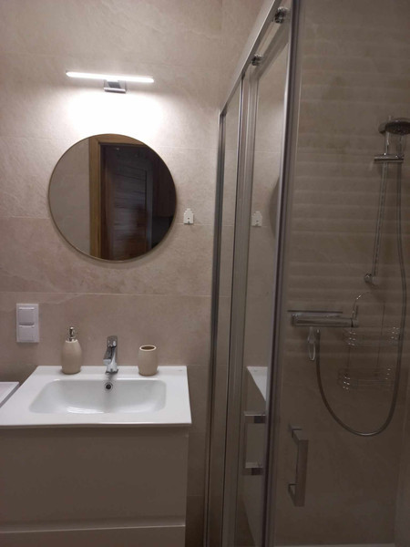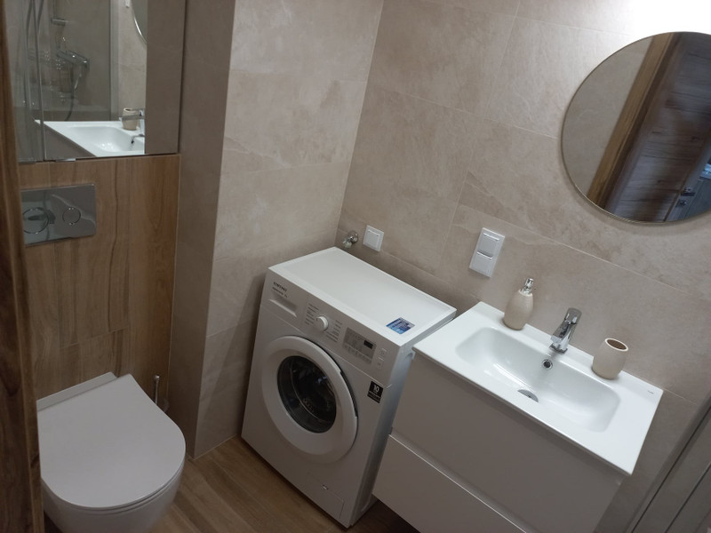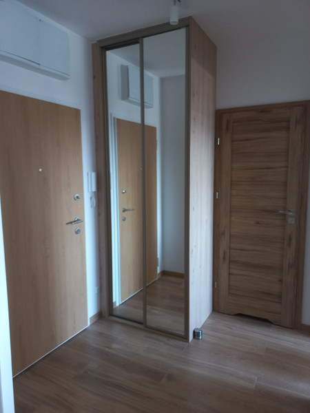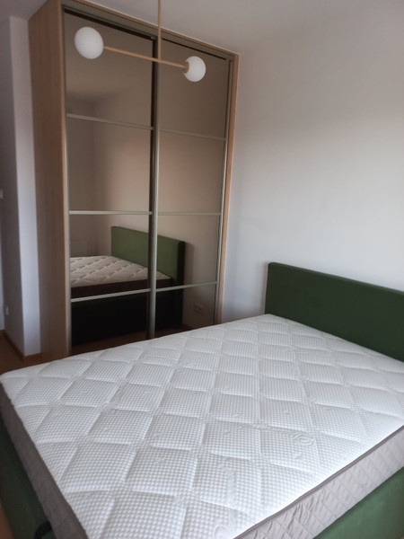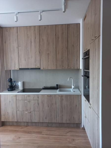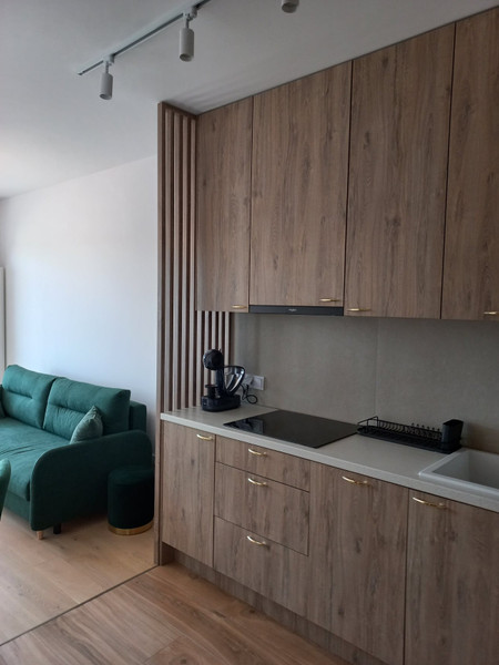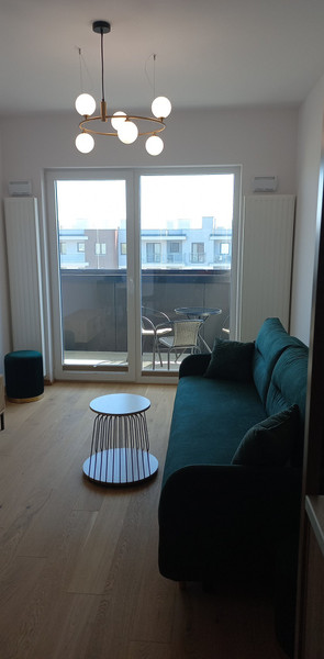 Ready for rent. Built in 2023, flat is on the 7th floor, direction east. It is equipped with an intercom, elevator, there is also security. Inside, there is a green patio and space for bicycles. The apartment is fully furnished. A living room with a balcony with a TV cabinet, coffe table, a table with chairs, a comfortable sofa. Beside bedroom with double 140 cm bed, large wardrobe and access to balcony. The kitchen is connected to the living room and is equipped with modern kitchen furniture and household appliances from renowned companies, a fridge, a dishwasher, an electric hob, a microwave, an oven and a hood. Modern lighting throughout the apartment. The bathroom has a comfortable shower and toilet and washing machine.