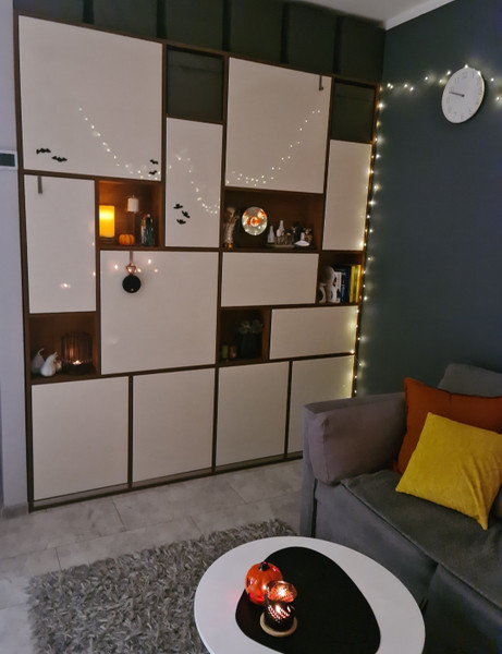 - salon: rozkładana kanapa 2- osobowa, stolik, meblościanka oddzielająca salon od wydzielonej strefy do spania,