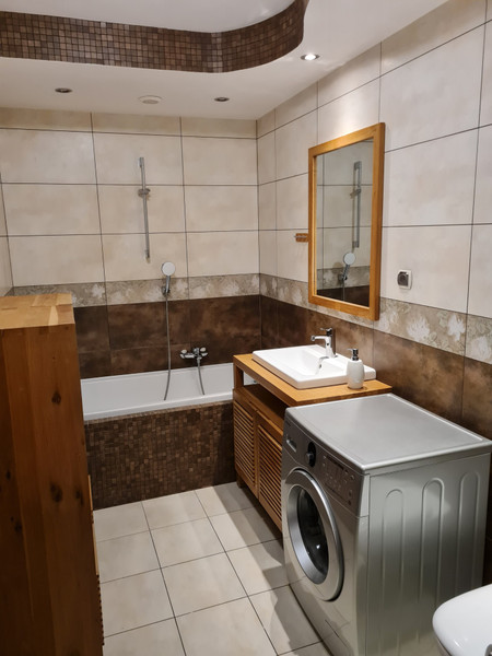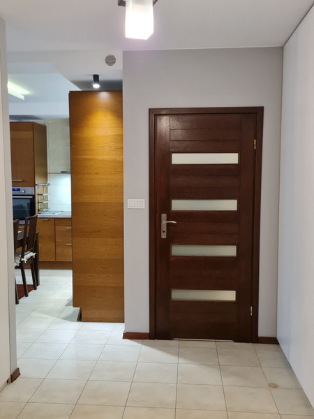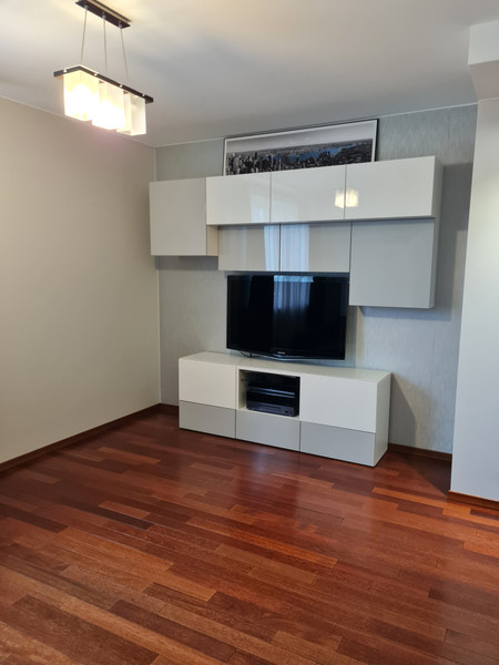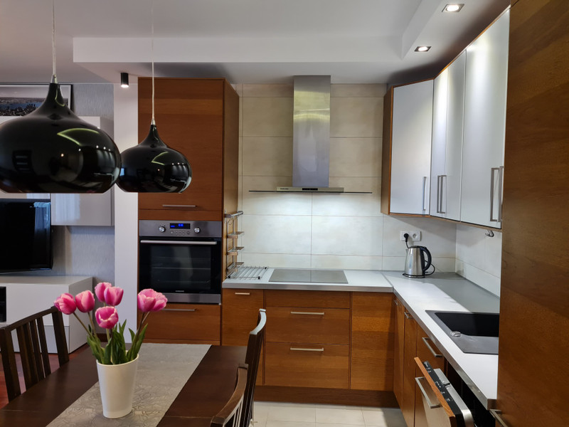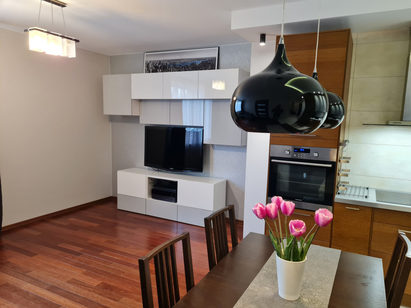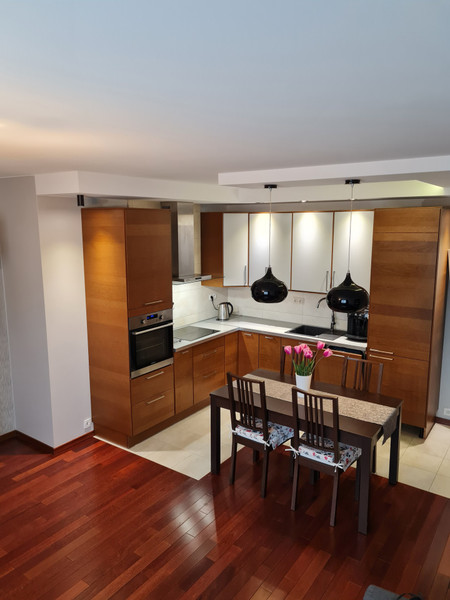 Kuchnia z zabudową i pełnym wyposażeniem AGD (piekarnik elektryczny Samsung, płyta indukcyjna i okap Samsung, lodówka Whirpool, zmywarka Electrolux). W pokojach na podłodze parkiet z drewna egzotycznego merbau. W przedpokoju oraz sypialni bardzo pojemne szafy na wymiar. Łazienka wyposażona w pralkę Samsung.