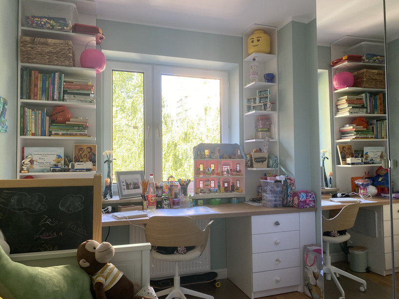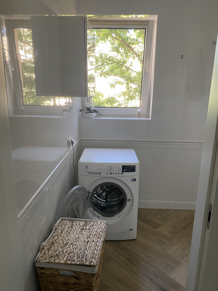 Mieszkanie jest umeblowane, w tym m.in. pralka, zmywarka, TV, szafy, biurko.