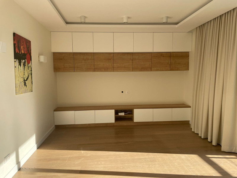 Salon z aneksem kuchennym – serce mieszkania. Aneks wyposażony w wyspę, która pełni rolę zarówno blatu roboczego, jak i stołu dla czterech osób. W wyspie znajdują się pojemne szuflady. W salonie zabudowa meblowa z dużą ilością szafek, możliwość dostawienia sofy.