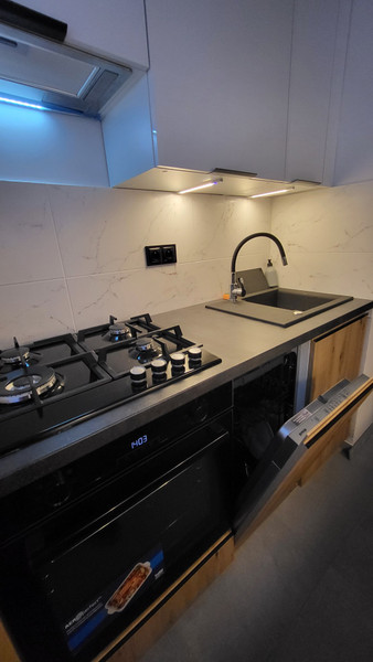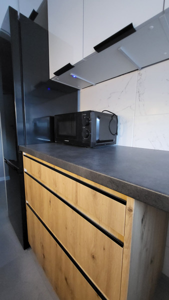 - nowa kuchnia z dużą ilością szafek ( sprzęt AGD: zmywarka, lodówka, płyta gazowa, piekarnik,