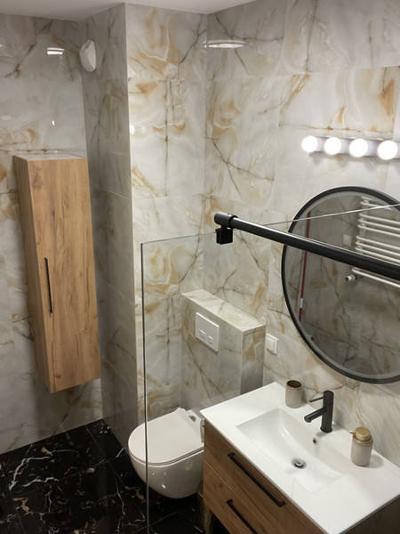 53 square meters consist of living room with open kitchen, bedroom, bathroom with walk-in shower as well as hall with desk, wardrobe and washing machine.