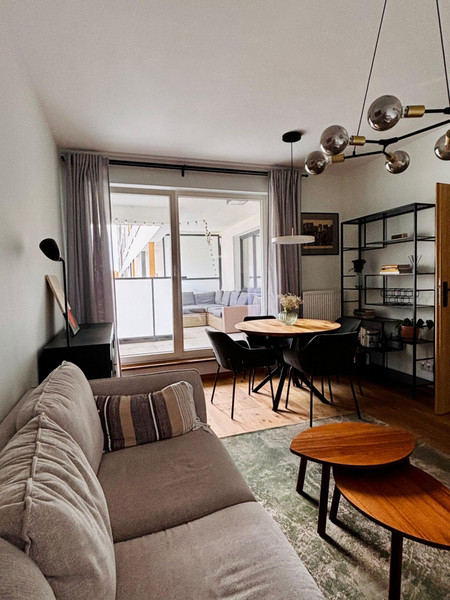 Oferuję na wynajem dwupokojowe mieszkanie o pow. 56 m² z pięknym 13 m² tarasem na 1 piętrze nowoczesnego budynku przy ul. Zwierzynieckiej (Mokotów, Sielce, skrzyżowanie ul. Czerniakowskiej i Gagarina).