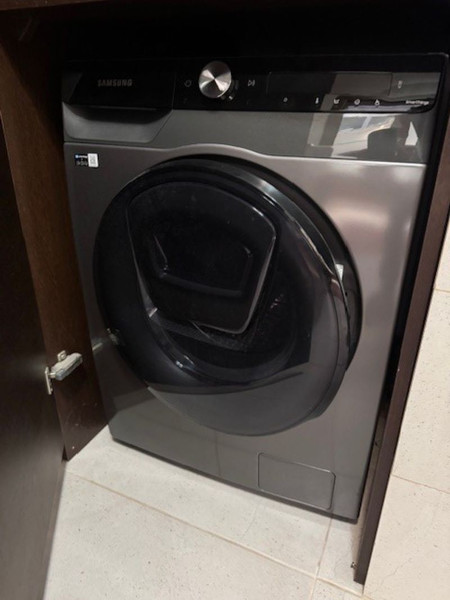 - łazienka z prysznicem, pralką i zabudową szafy;