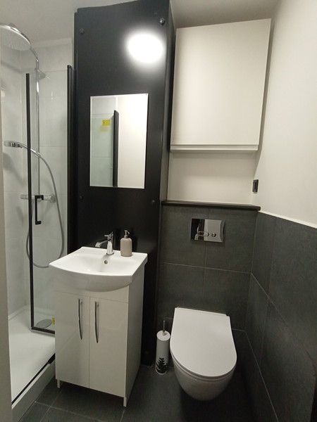 - łazienki z kabiną prysznicową z deszczownicą, szafką z umywalką, WC oraz szafkami wiszącymi.