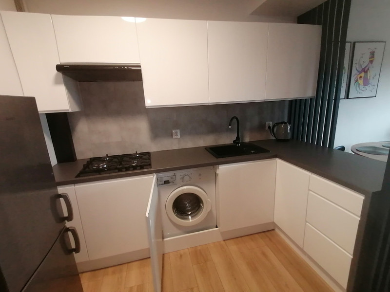 - aneksu kuchennego z płytą gazową, okapem, pralką wbudowaną w szafkę oraz lodówką.