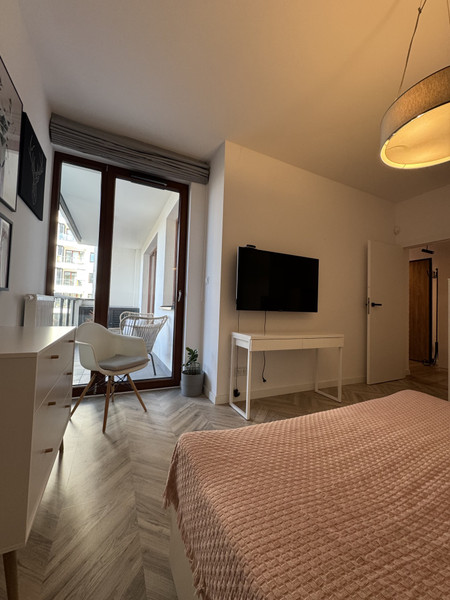 Pięknie wykończone i umeblowane. Na wyposażeniu mieszkania są: pralko-suszarka, lodówko-zamrażarka, płyta indukcyjna, piekarnik, 2 x telewizor (w salonie i sypialni), soundbar, czajnik elektryczny, szklanki, kieliszki, kubki i filiżanki.