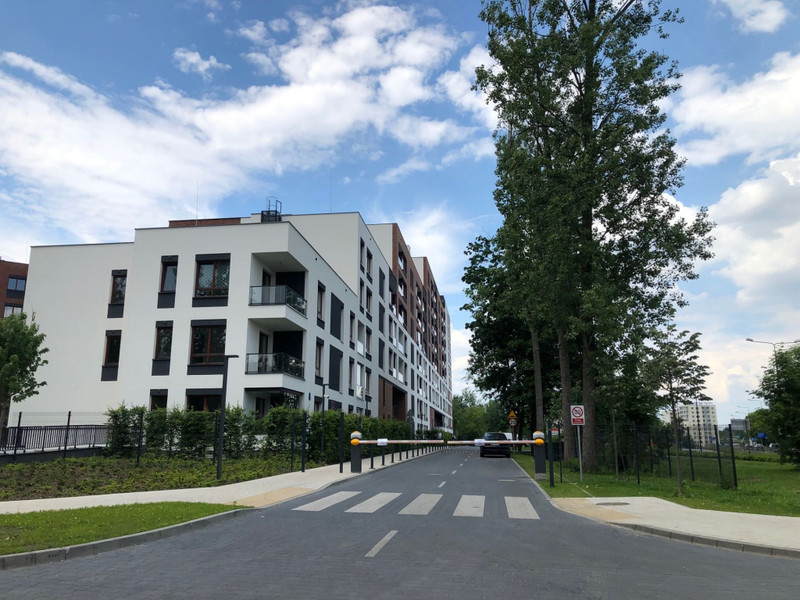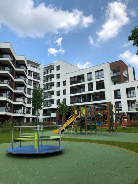 The estate is secure, with playgrounds and sports fields for residents. At street level, there are shops and service outlets for residents (Żabka, bakery, barber).