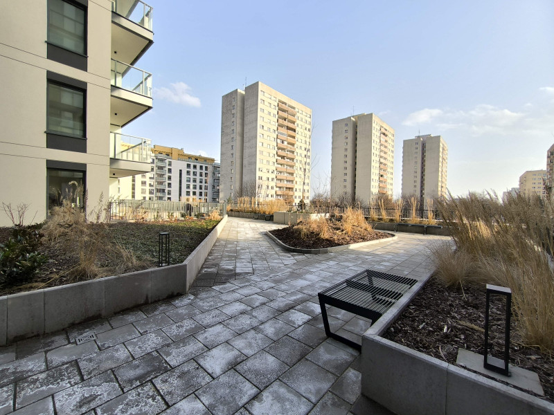 W budynku na dole sklep spożywczy Frac i Rossmann, a na poziomie 2. zewnętrzna strefa relaksu tylko dla mieszkańców.