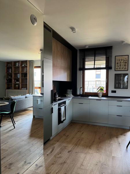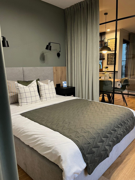 Nowy, 2-pokojowy apartament wykończony został wysokiej jakości materiałami. Salon i sypialnię przedzielono szklaną ścianką (podwyższona akustyka), co nadaje mieszkaniu przestronności oraz uroku. Z sypialnią połączona jest wygodna garderoba. Zabudowy meblowe wykonane na wymiar w kuchni, salonie, przedpokoju czy łazience dają wiele miejsca do przechowywania i pozwalają utrzymać porządek. W całym apartamencie drewniane podłogi.