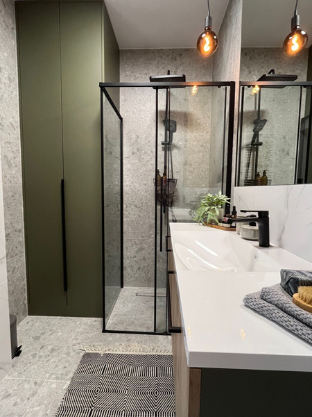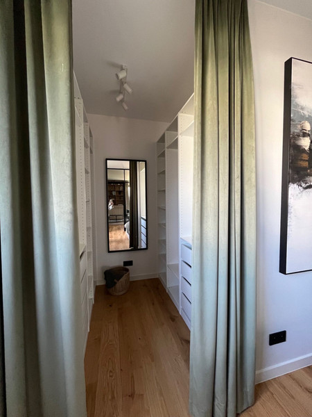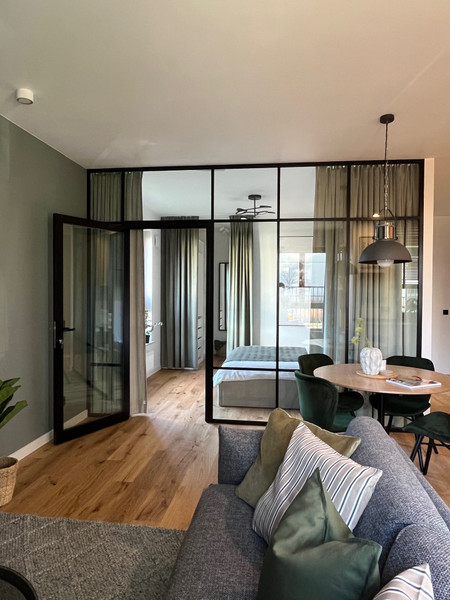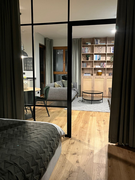 This new, 2-room apartment has been finished with high-quality materials. The living room and bedroom are separated by a glass wall (improved acoustics), which gives the apartment a spacious feel and charm. The bedroom is connected to a comfortable walk-in wardrobe. Custom-made furniture in the kitchen, living room, hall and bathroom provides plenty of storage space and helps to keep things tidy. Wooden floors throughout the apartment.
