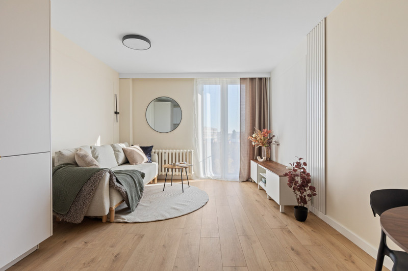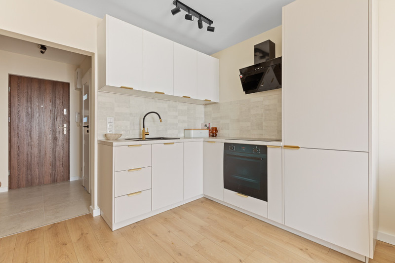 Lokal urządzony w nowoczesnym, jasnym stylu, z drewnianą podłogą i neutralną kolorystyką. Funkcjonalny układ daje poczucie przestrzeni mimo kompaktowego metrażu. Duże okno zapewnia dobre doświetlenie i widok na okolicę.