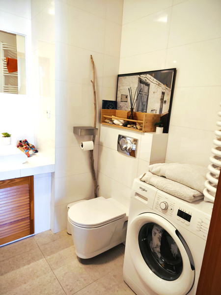 Wyposażenie: Sprzęt AGD marek Electrolux i Whirlpool oraz klasyczna łazienka w bieli z wanną.