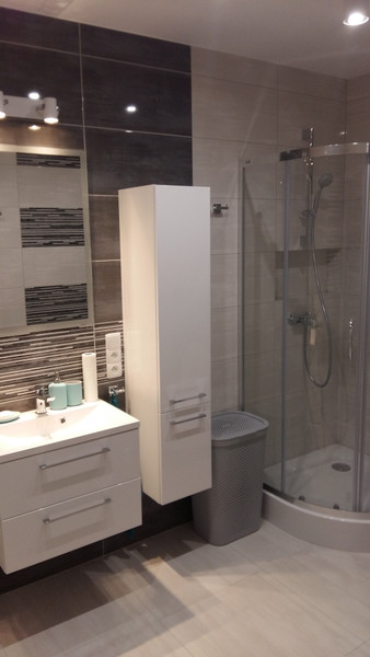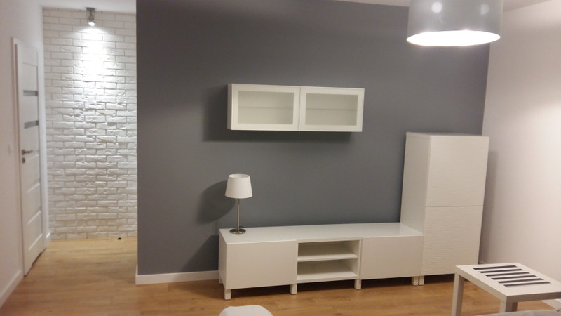 Mieszkanie o powierzchni 48 m2 składa się z salonu połączonego z kuchnią, sypialni z garderobą, łazienki z kabiną prysznicowa, przedpokoju z szafą wnękową oraz balkonu. Lokal jest nowocześnie wykończony, ładnie urządzony, w pełni umeblowany oraz wyposażony w sprzęt AGD (zmywarka, pralka, lodówka, zamrażarka, płyta indukcyjna, piekarnik, mikrofalówka, czajnik oraz odkurzacz).