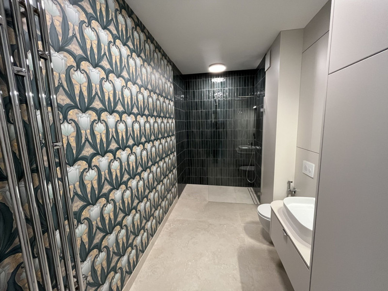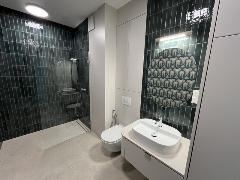 • Przestronna łazienka z kabiną prysznicową typu walk-in, pralką i suszarką w zabudowie,