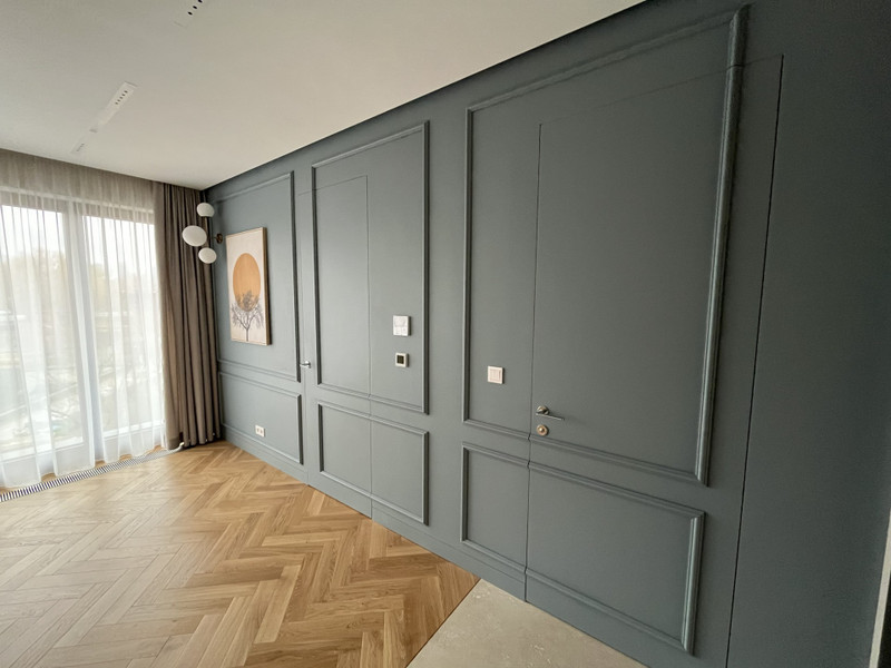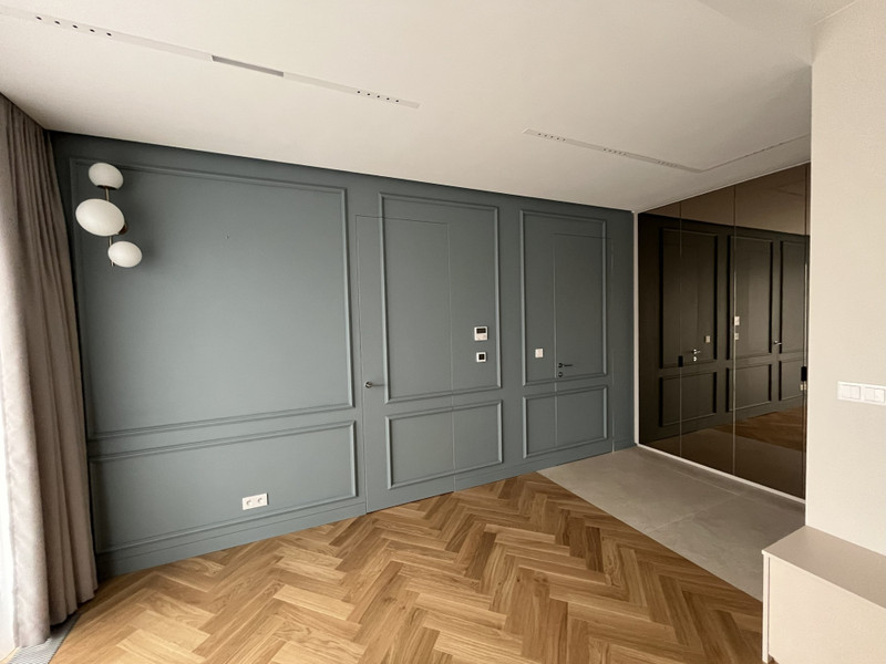 • Hol wejściowy z dużym lustrem i zabudową garderobianą.