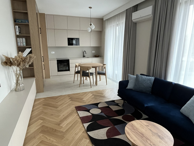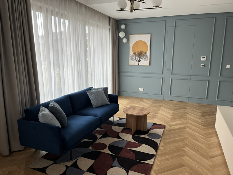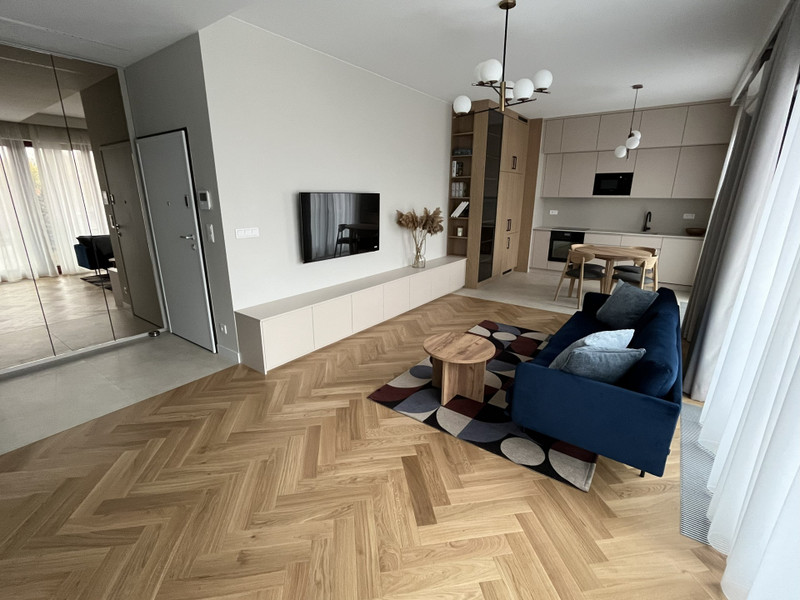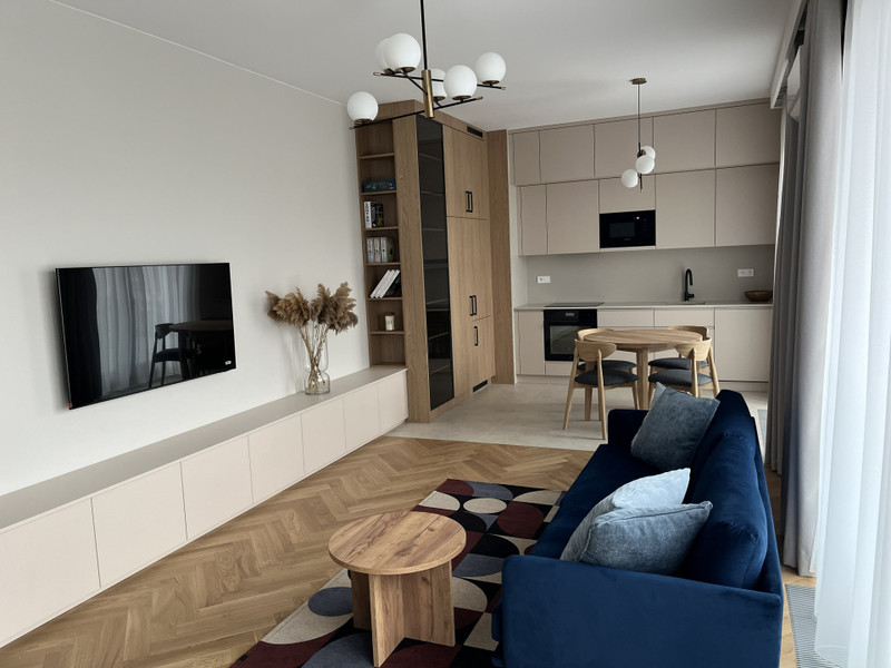 • Przestronny salon z designerskim oświetleniem, elegancką sofą i strefą TV, połączony z aneksem kuchennym,