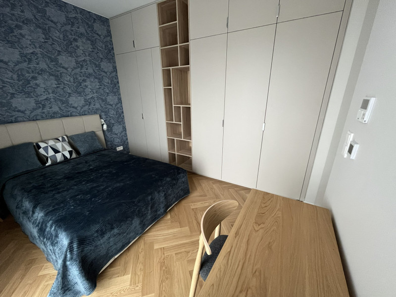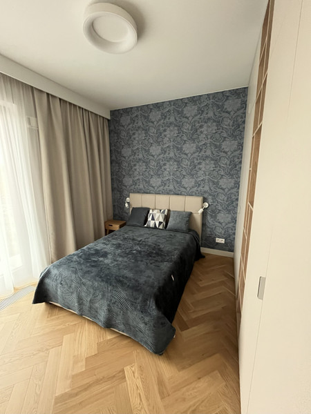 • Sypialnia z wygodnym łóżkiem, pojemną szafa w zabudowie i dekoracyjną tapetą,