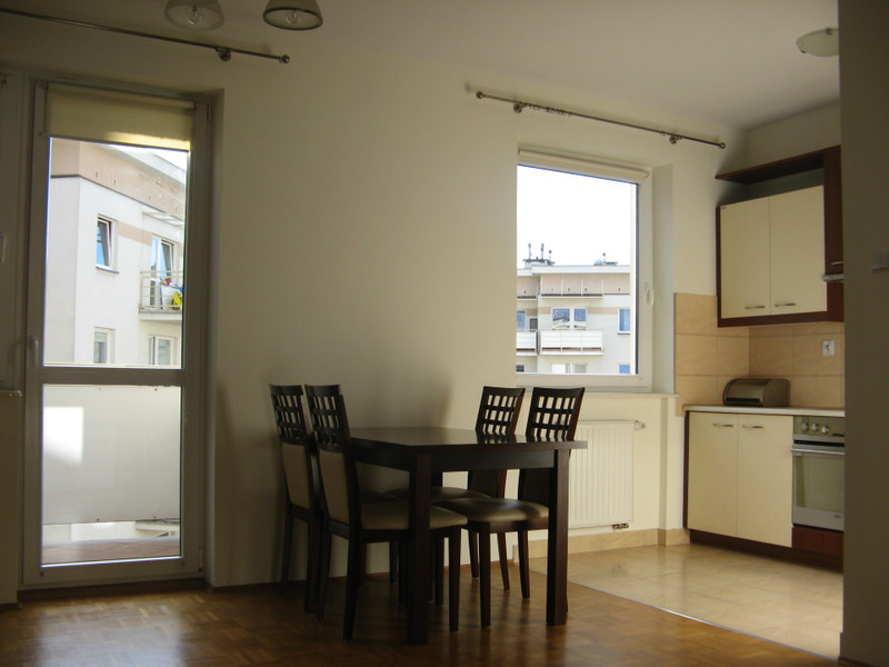 Do wynajęcia kawalerka, 32 m², przy ul. Namysłowskiej (Praga Północ; 2005 rok budowy), na zadbanym osiedlu strzeżonym. Na funkcjonalną, otwartą przestrzeń składa się: część dzienna z kanapą narożną, dwoma komodami i półkami na ścianie, wydzielona wnęka z dwuosobowym łóżkiem oraz w pełni wyposażona kuchnia (zabudowa meblowa + stół i 4 krzesła, kuchenka elektryczna, lodówka, zlew narożny). W łazience umieszczona jest wanna oraz pralka, natomiast w przedpokoju obszerna szafa. Do mieszkania przynależy również piwnica. Mieszkanie jest na drugim piętrze (winda), a okna wraz z balkonem wychodzą na stronę wewnętrzną osiedla.