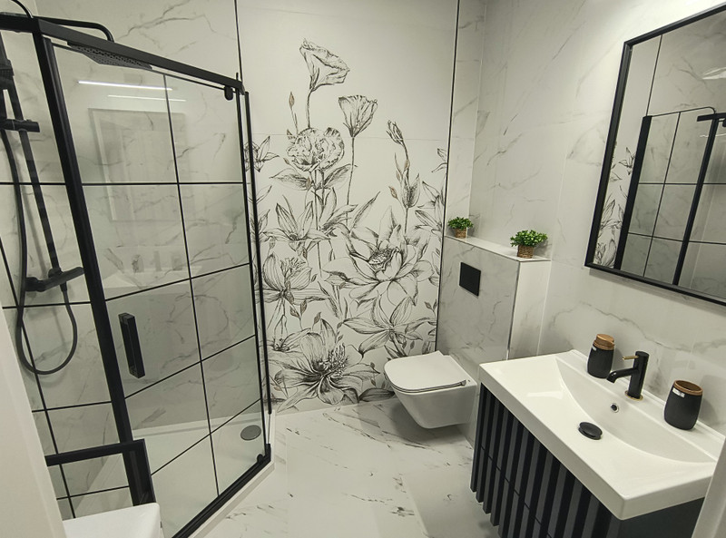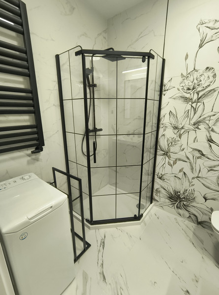 Łazienka ok. 5 m2 całkowicie wyremontowana wykończona gresem z nową armaturą sanitarną i nową kabiną natryskową, nowym lustrem i szafką , pralką.