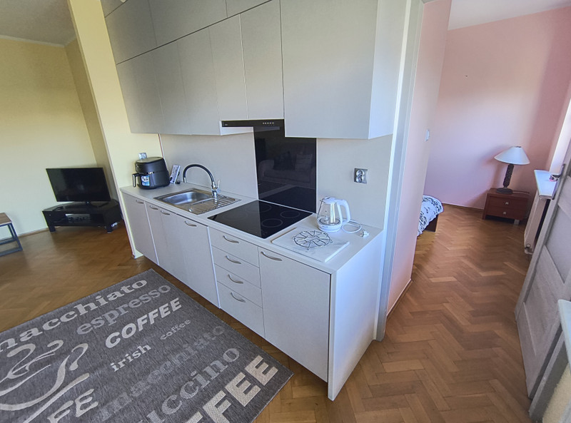 W 1 pokoju (ok. 20 m2) znajduje się nowy aneks kuchenny wyposażony w sprzęt AGD (elektryczna płyta ceramiczna, lodówka, nowa zmywarka, nowy Air Fryer , okap kuchenny ), nowe meble ( sofa, komoda, regalik, stół, 4 krzesła, stolik kawowy, lamka nocna ) , klimatyzacja, nowe rolety okienne.