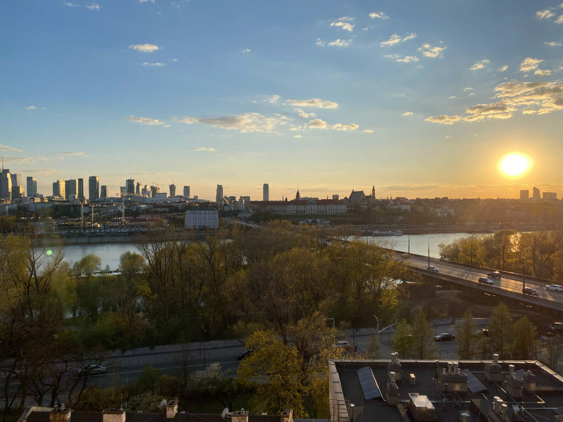 Piękny widok przez Wisłę na Stare Miasto i panoramę Warszawy.