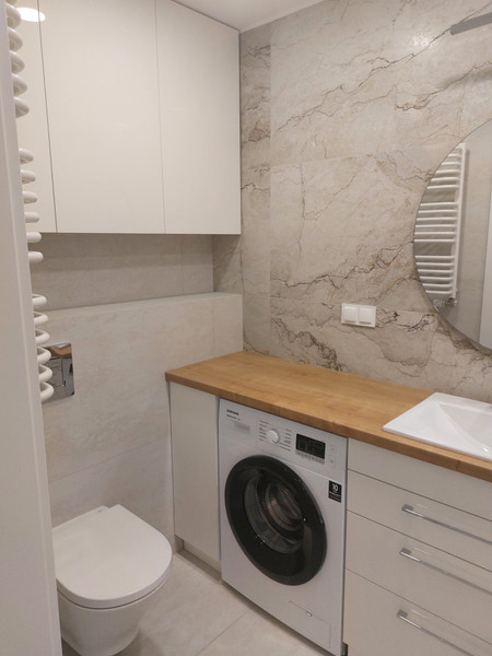 Łazienka - prysznic, zabudowy meblowe, pralka.