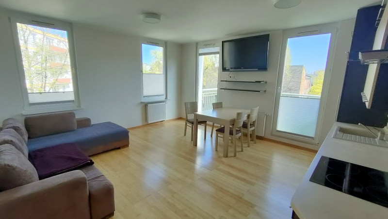 Umeblowane: w sypialni łóżko 160x200, w salonie rozkładana sofa (dwa dodatkowe miejsca do spania), stół i 4 krzesła. Dwie duże i wygodne szafy wnękowe. W salonie telewizor, w aneksie kuchennym zmywarka, lodówka, piekarnik i blat indukcyjny.
