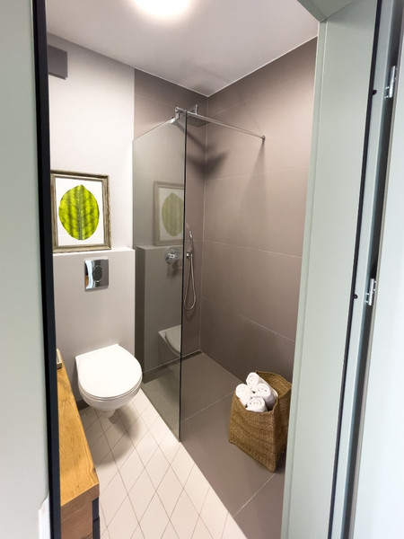 W łazience kabina prysznicowa.