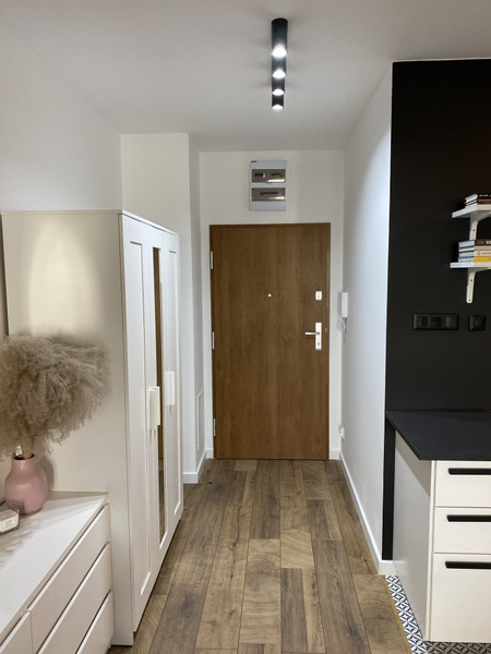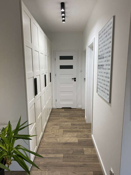 Przy drzwiach wejściowych jest korytarz z dodatkową szafą oraz komodą. Kuchni nie widać od wejścia.