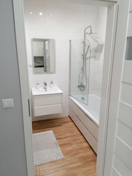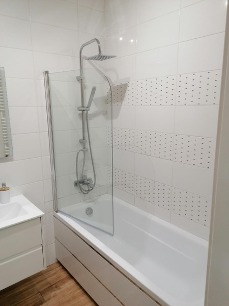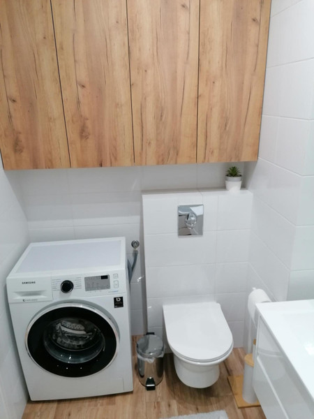 Łazienka: pralka, wanna z parawanem, szafka pod umywalką