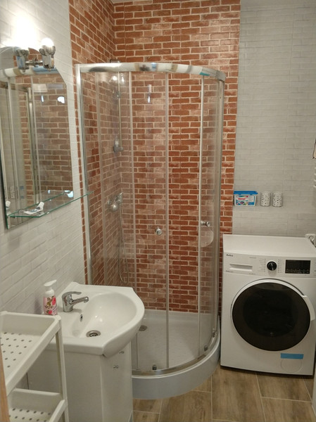 • Łazienka: Kabina prysznicowa, pralka Amica oraz toaleta.