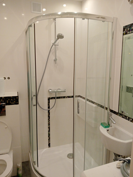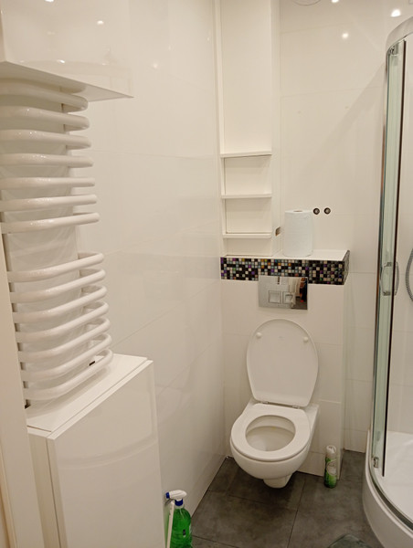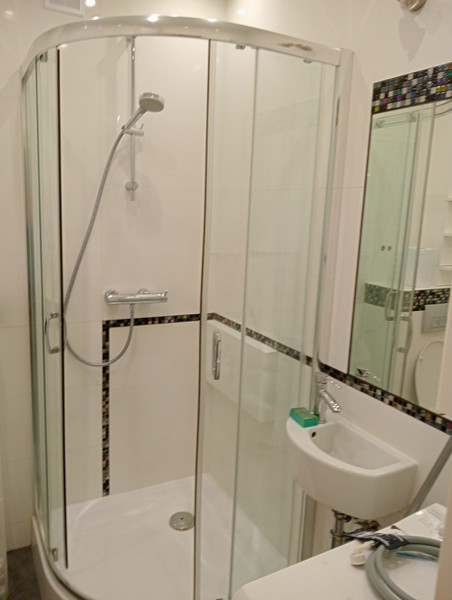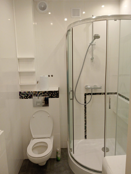 3. Łazienka z kabiną prysznicową, pralką, szafka na kosmetyki.
