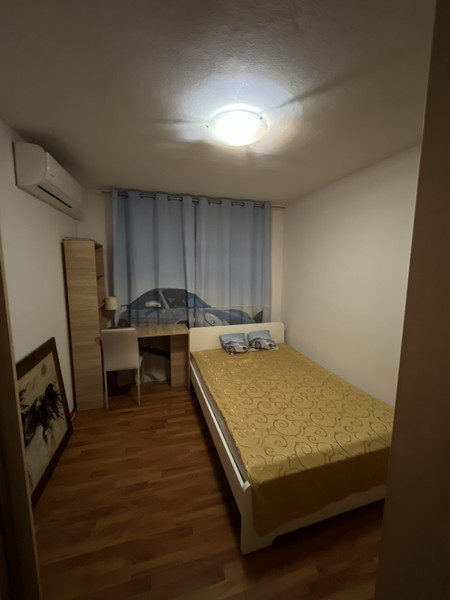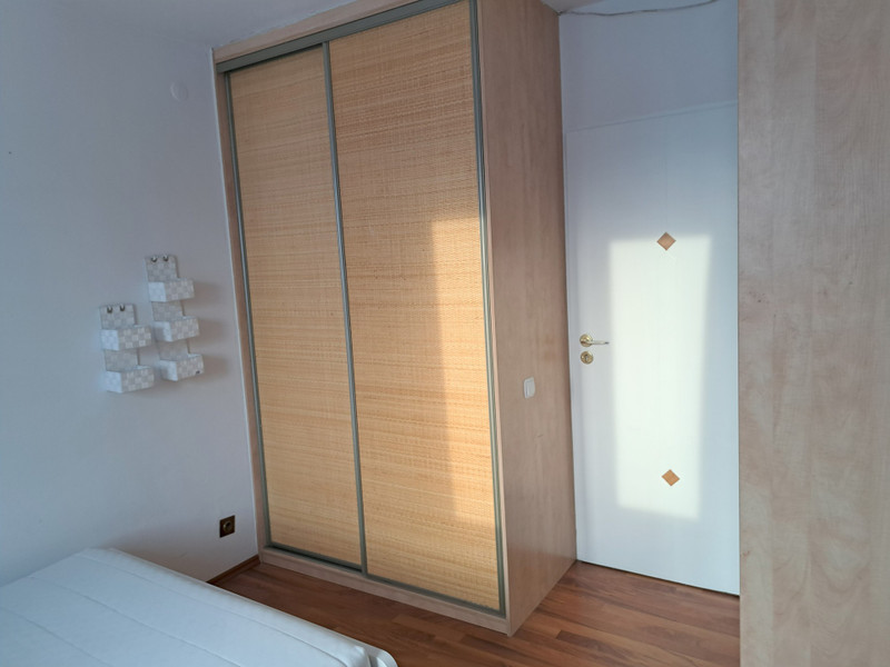 2. Drugi pokój ok 11,5m2 z klimatyzacją, wygodne łóżko 140cm szerokości, małe biurko z fotelem, dwie obszerne szafy w zabudowie, jedna z lustrem. (na zdjęciu niebieskie zasłony)