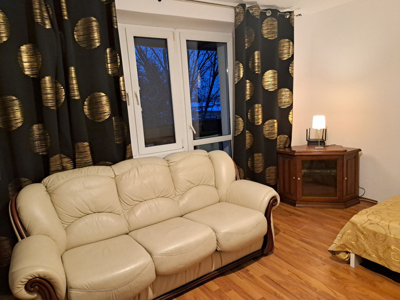 3. Trzeci pokój ok. 19,5 m2 z balkonem, wygodne łóżko 140cm szerokości, szafka nocna, duży stół z 2 krzesłami, sofa z jasnej skóry z możliwością okazjonalnego rozkładania do spania dla 2 osób, meble z litego drewna tj. witryna podświetlana, duża komoda. (na zdjęciu ciemne zasłony w złote kręgi)