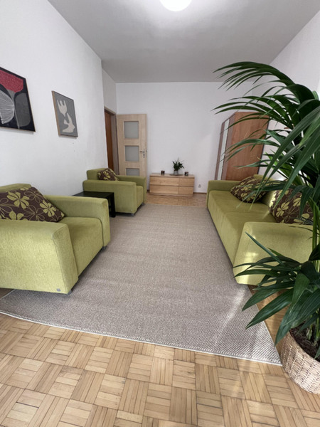 W salonie: rozkładana kanapa, 2 fotele, stolik, duża szafa, regał, komoda. Wyjście na dużą loggię.